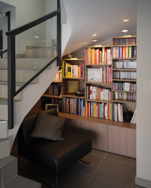 Nous jouons également avec la verticalité comme avec une étagère haute, une bibliothèque ou une armoire suspendue, etc. Ici, l’idée c’est de libérer de l’espace au sol pour y installer un canapé et créer un coin détente. La grande tendance est aux solutions modulables comme les portes coulissantes ou les tiroirs compartimentés. Nous faisons en sorte d’aménager chaque espace disponible, même s’il est tout petit comme un recoin sous un escalier.