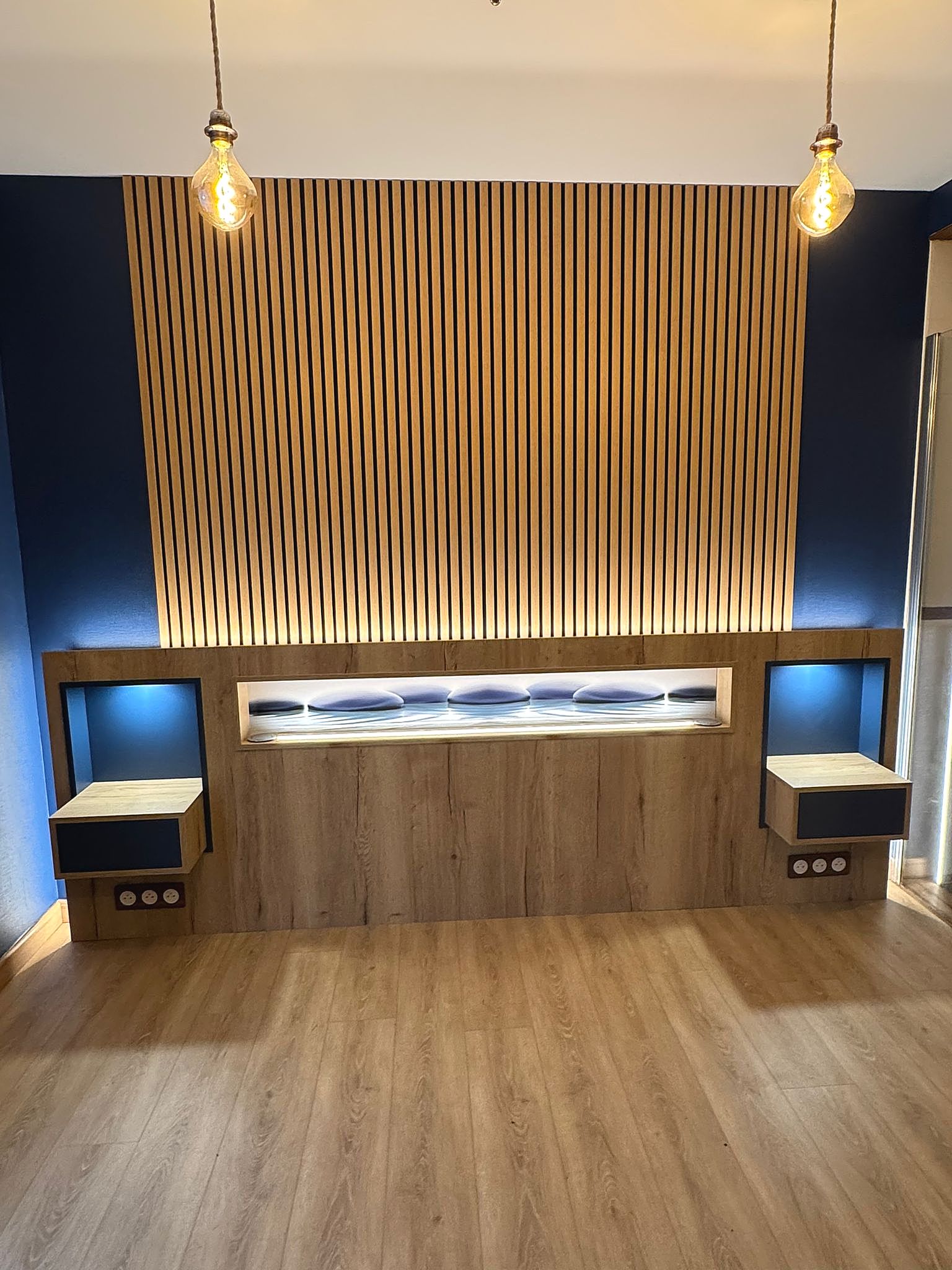 La société a accompagnée de nombreux particuliers dans la région de Nantes pour la réalisation d’agencement de chambre à coucher.